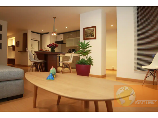 Cód. 1287 Lindo apartamento con muebles y totalmente remodelado de 74 m², con diseño moderno y excelente distribución. Cuenta con 2 habitaciones, (la segunda habitación es pequeña con cama sencilla, también se puede usar como estudio) 2 baños completos que están afuera de las habitaciones, sala-comedor, cocina abierta y pisos laminados. Incluye 1 parqueadero independiente.